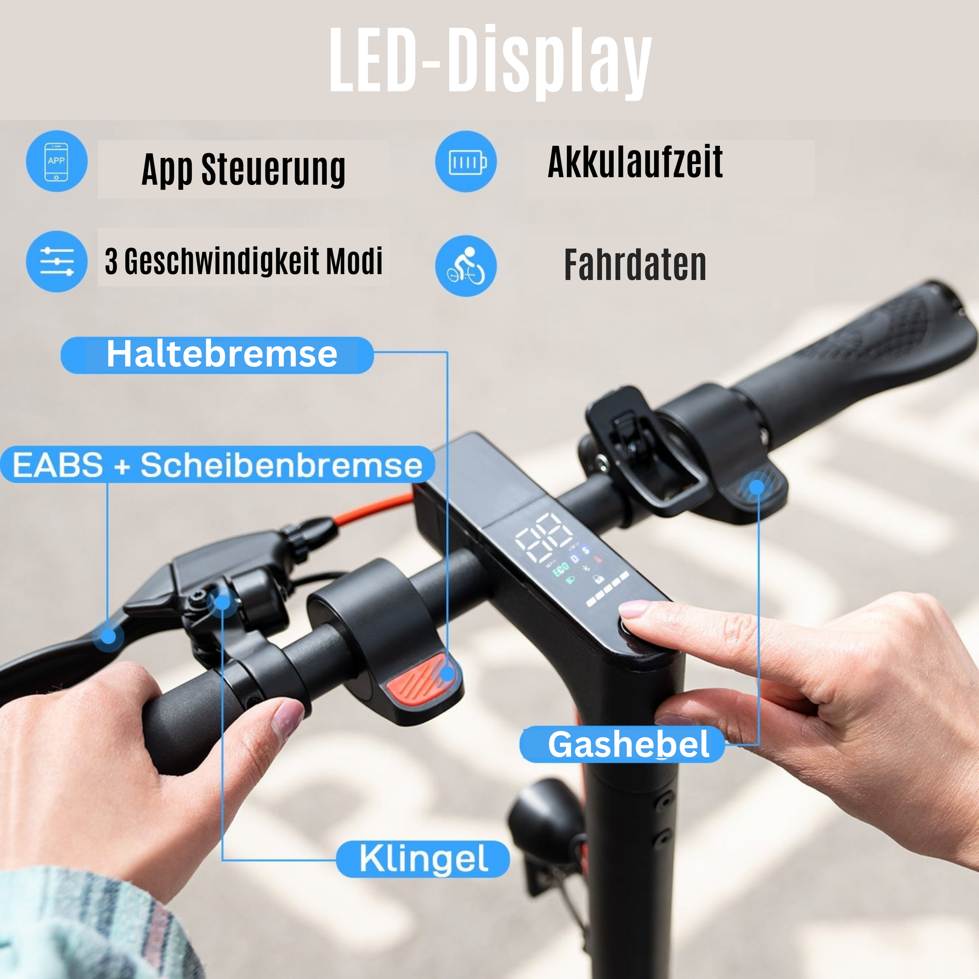 Mit der LED Anzeige und der App "EVERCROSS PRO" können Sie Ihre Geschwindigkeit, Distanz und Akkulaufzeit in Echtzeit verfolgen. Die App ermöglicht es Ihnen auch, den Elektrisch Scooter zu ver- und entriegeln.